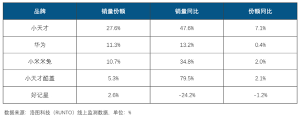 尽管华为、小米米兔分别以11.3%、10.7%的份额位列第二、第三,但二者份额增速显著低于小天才。