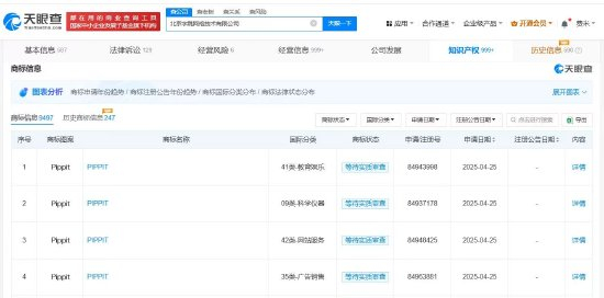 新浪科技讯 5月22日下午消息,天眼查显示,近日北京字跳网络技术有限公司申请注册多枚“PIPPIT”商标,国际分类包括教育娱乐、科学仪器、网站服务、广告销售,当前商标状态均为等待实质审查。