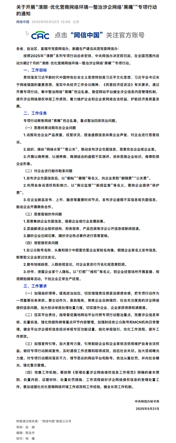 快科技5月22日消息,今日,网信官方公众号发布《关于开展“清朗·优化营商网络环境—整治涉企网络‘黑嘴’”专项行动的通知》。