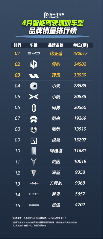 基于乘联会及第三方数据交叉验证的 “智能驾驶辅助车型4月品牌销量排行榜” 显示,比亚迪优势巨大,领先优势超鸿蒙智行、理想、小鹏等品牌销量总和两倍,中国智驾汽车市场 “一超多强” 格局显现。