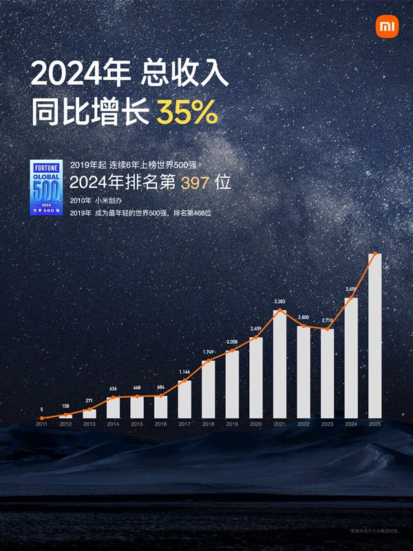 根据财报,小米2024年总收入同比增长35%,世界500强排名397位,连续六年上榜,而且是最年轻的世界500强。