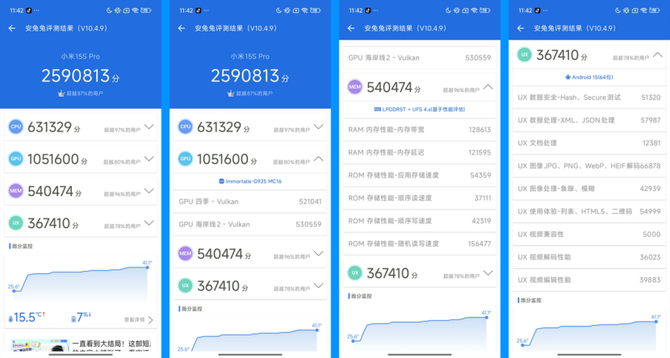 基于安兔兔V10的跑分上,我们能够看到小米15S Pro的综合得分为259万分,并且在室温25℃的环境中,这个分数已经目前87%的机型,进行横向对比的话,这个成绩基本上完全是旗舰级的水准,和高通骁龙8 至尊版和天玑9400基本上是在一个水平上,能够胜任各种类型的游戏大作,日常应用,性能表现非常出色。