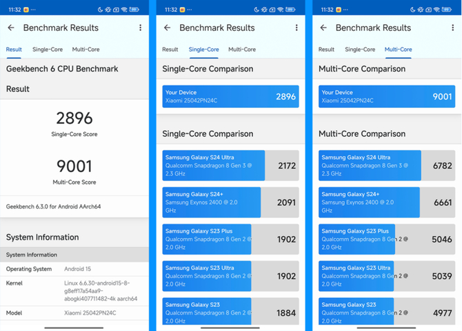 另外一项性能测试中可以看到,小米15S Pro的GeekBench 6的测试中可以看到单核心的分数为2896,多核心的分数为9001,这样的性能表现相对上代高通骁龙8Gen3单核心性能领先超过33%,多核心性能领先32.7%,和现阶段的旗舰高通骁龙8至尊版也是完全在同一水平线上的。