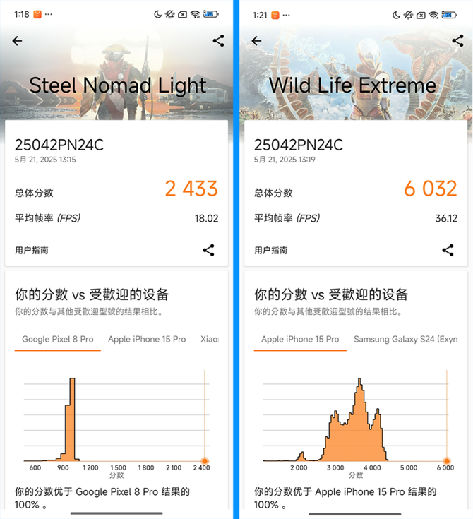 同样的测试手机图形能力的Steel Nomad Light测试中,小米15S Pro的总体分数来到了2433,平均帧率则是18.02FPS,另外一项Wild Life Extreme测试中,平均帧率上达到了36.12FPS,总体分数来到了6032。