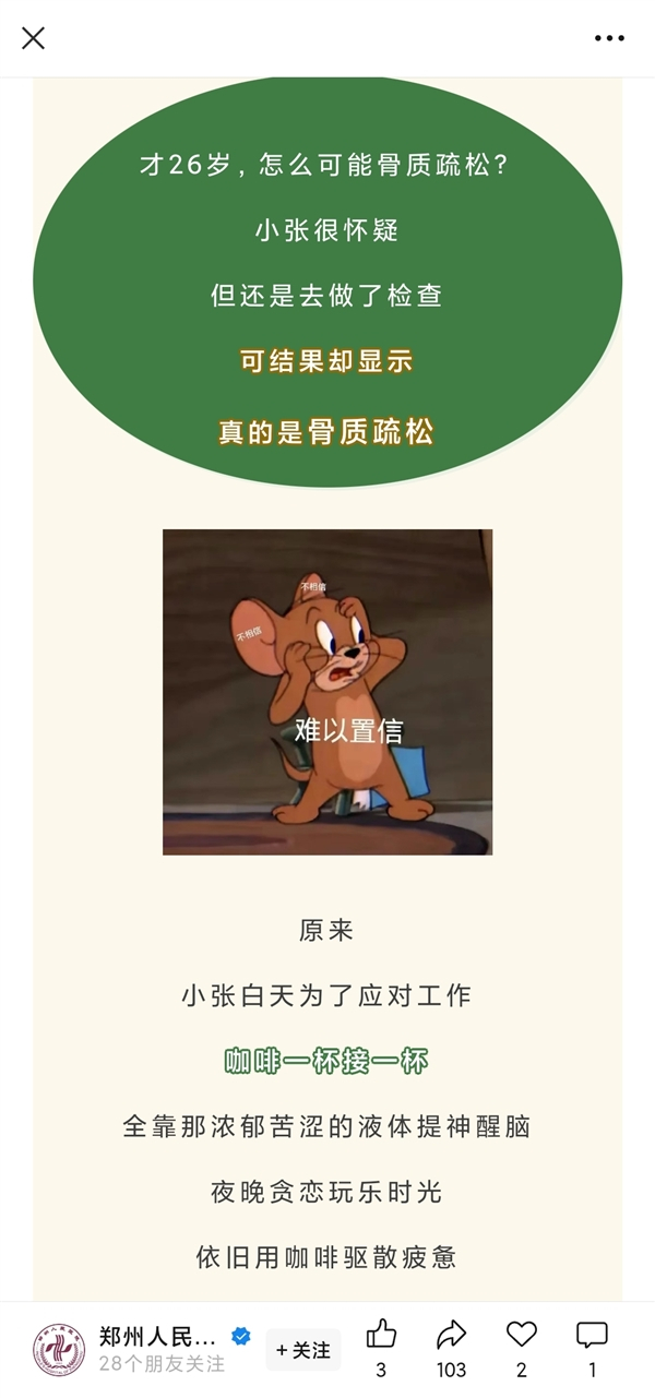 5月22日消息,据报道,26岁的小张被确诊为骨质疏松,医生询问病史发现,小张为了应对工作咖啡一杯接一杯,全靠那浓郁苦涩的液体提神醒脑,出门时防晒衣、遮阳伞、墨镜齐上阵,绝不让阳光有可乘之机。
