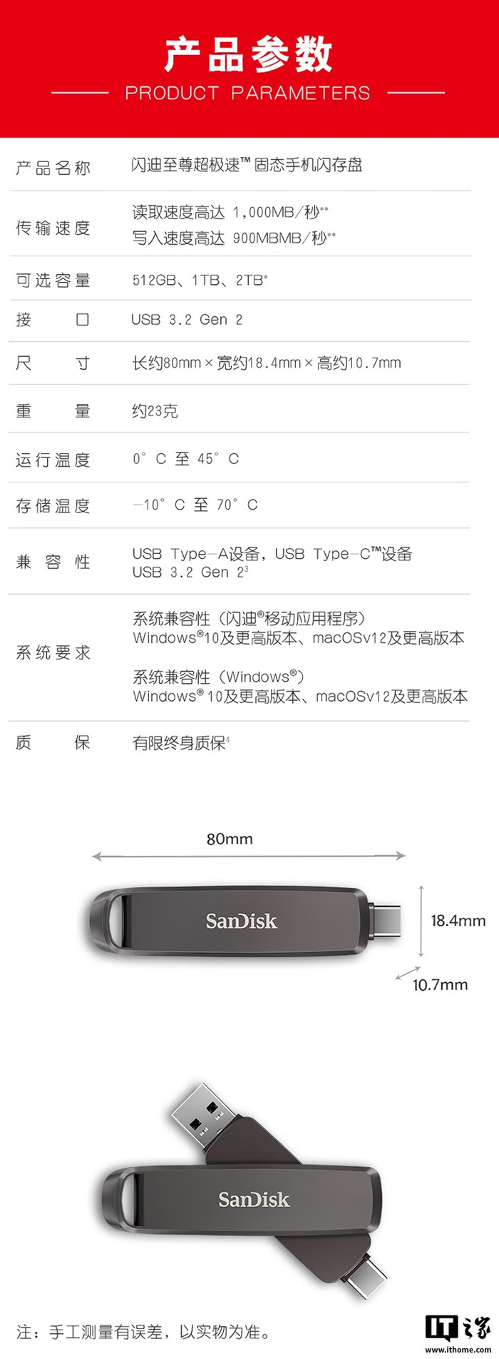 该 U 盘为 USB 3.2 Gen 2 接口,读取速度至高 1000MB/s、写入速度至高 900MB/s,IT之家附产品规格如下:
