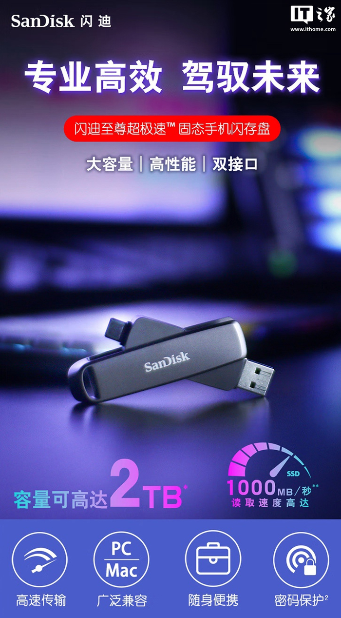 闪迪推出 USB-A / C 双接口 U 盘 DDE1:读速 1000MB/s、可选 512G-2T,469 元起