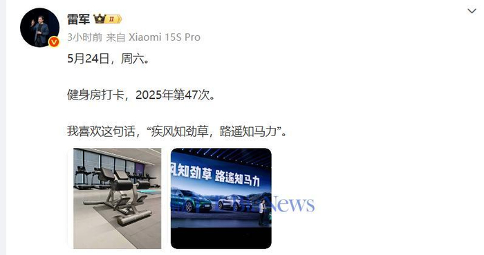 5月24日,小米集团创始人雷军分享2025年第47次健身房打卡,并表示:“我喜欢这句话,'疾风知劲草,路遥知马力'。 ”