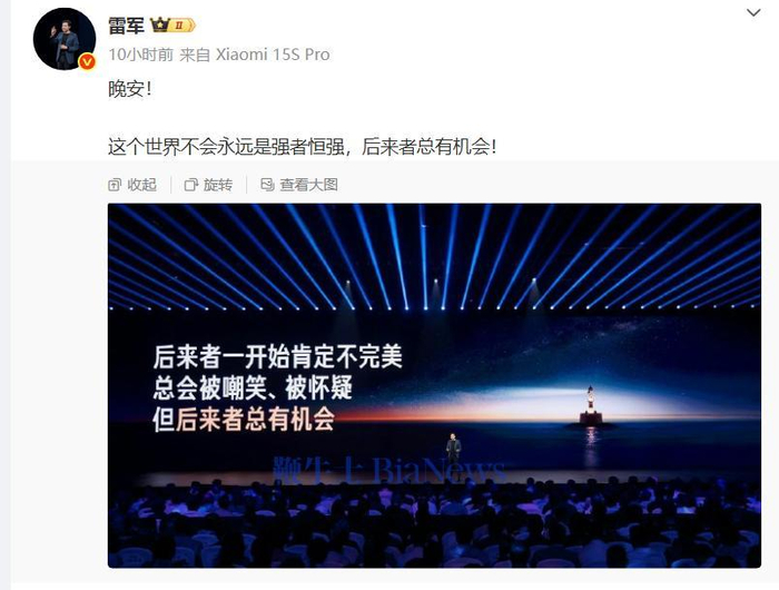 并附上一张在小米15周年战略新品发布会上的演讲配图:“后来者一开始肯定不完美,总会被嘲笑、被怀疑,但后来者总有机会。”