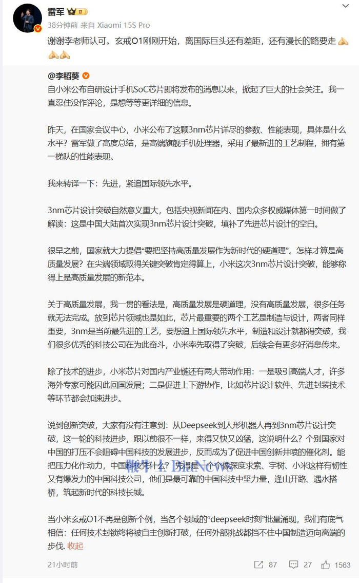 雷军:玄戒O1刚开始,离国际巨头还有差距 Bianews 2025.05.2418:02 关注 5月24日,雷军转发经济学家李稻葵的微博表达感谢,并表示:玄戒O1刚刚开始,离国际巨头还有差距,还有漫长的路要走。 雷军:玄戒O1刚开始,离国际巨头还有差距苹果WWDC25官宣:iOS19变圆了特朗普:如苹果不在美国生产iPhone,将征收25%关税极米失速小米玄戒登记O1芯片视觉设计图让人熟悉又陌生的雷军