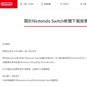 通知指出,此次价格调整将于 2025 年 6 月 1 日(星期日)起正式生效。任天堂(香港)表示,公司将持续密切留意香港市场环境,并适时作出相关调整。