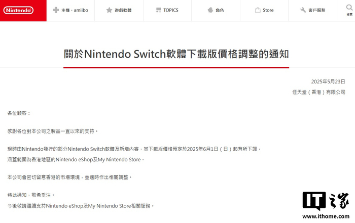 IT之家 5 月 24 日消息,任天堂(香港)有限公司昨日发布通知,将对由任天堂发行的部分 Nintendo Switch 软件下载版及新增内容(DLC)进行价格下调,范围为中国香港地区 Nintendo eShop 及 My Nintendo Store。
