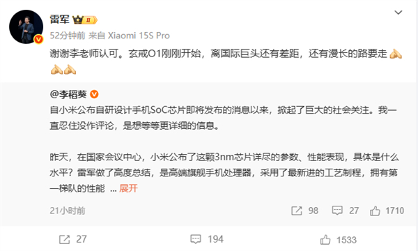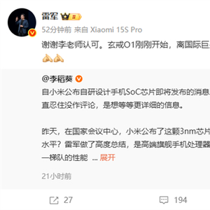 对于李稻葵的高度评价,雷军表示:“玄戒O1刚刚开始,离国际巨头还有差距,还有漫长的路要走。”
