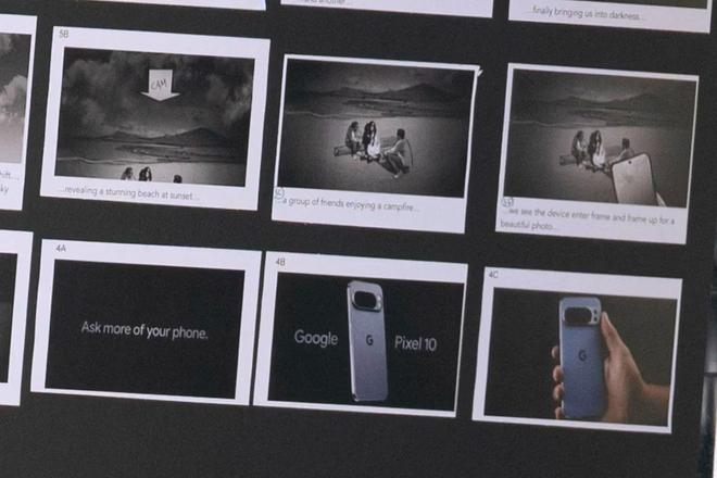 消息源称他在加拿大温哥华目击了一场“完整的谷歌 Pixel 10 广告拍摄”,现场曝光的故事板明确标注了“Pixel 10”字样,广告标语为“Ask more of your phone”。IT之家附上相关图片如下: