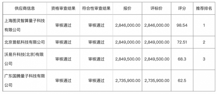 入围供应商包括上海图灵智算量子科技有限公司、北京普航科技有限公司、沃易升科技(北京)有限公司、广东国腾量子科技有限公司。