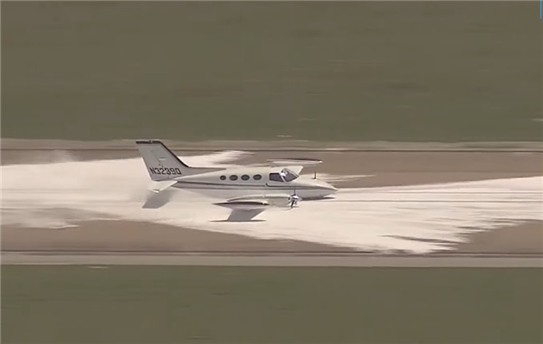 该飞机大约在中午12:42降落在泡沫覆盖的跑道上,两名乘客安全撤离且未受伤。