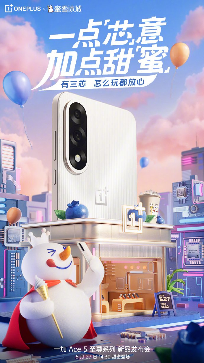 IT之家 5 月 26 日消息,一加此前官宣 Ace 5 至尊版的新朋友“蜜雪冰城”,并表示“欢迎雪王来一加手机发布会”,预示将带来联名产品。最新预热显示,一加将推出雪王独家定制系列配件。
