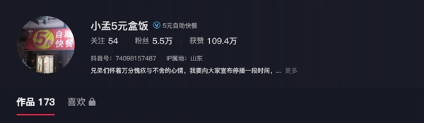 在短视频平台上,店老板收获了不少关注度,其粉丝数为5.5万,获赞109.4万,发布作品173个。