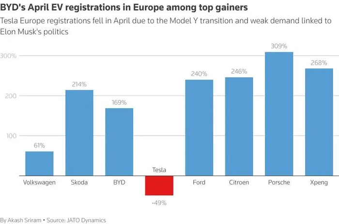 研究机构JATO Dynamics发布关于28个欧洲国家的数据显示,在欧洲市场四月份的纯电车型(BEV)销量排行中,中国电动车制造商比亚迪销量达到7231辆,以不到百辆优势超过特斯拉销售的7165辆,销量首次超过特斯拉。