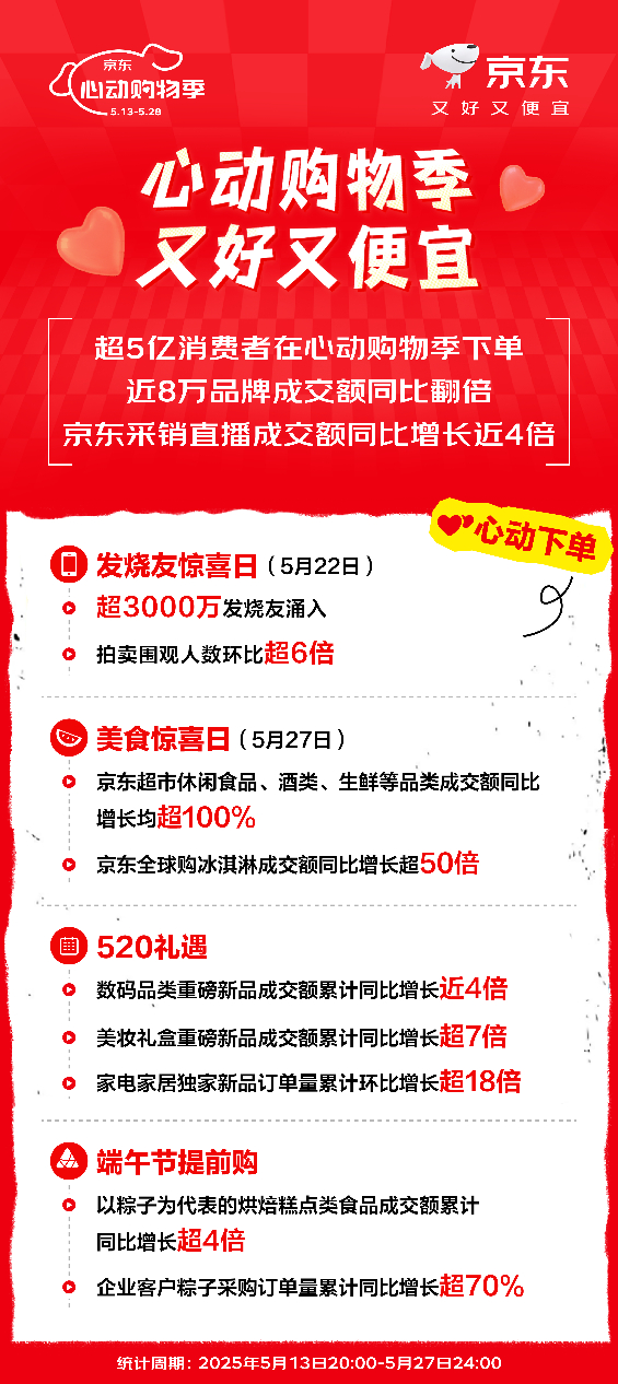 京东刚刚发布了心动购物季截至5月27日24点的战报。数据显示,自5月13日晚8点至27日24点,京东心动购物季超5亿消费者下单,近8万品牌成交额同比翻倍,京东采销直播成交额同比增长近4倍。