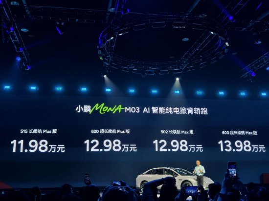 售价方面,小鹏MONA M03 Max的502长续航Max版售价12.98万元,600超长续航Max版售价13.98万元;另外,小鹏MONA M03还推出了515长续航Plus版售价11.98万元,以及620超长续航Plus版售价12.98万元。