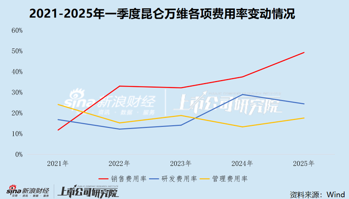 自2022年提出“All in AI”的口号后,昆仑万维的销售费用便犹如“脱缰野马”一发不可收拾,2023年、2024年及2025年一季度,其销售费用的同比增速分别为3.41%、42.23%及92.11%,逐年成倍增长。