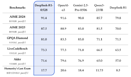 据介绍,DeepSeek-R1-0528 仍然使用 2024 年 12 月所发布的 DeepSeek V3 Base 模型作为基座,但在后训练过程中投入了更多算力,显著提升了模型的思维深度与推理能力。官方称更新后的 R1 模型在数学、编程与通用逻辑等多个基准测评中取得了当前国内所有模型中首屈一指的优异成绩,并且在整体表现上已接近其他国际顶尖模型,如o3与Gemini-2.5-Pro。