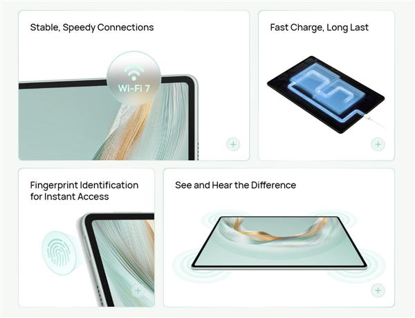 平板内置10100mAh电池,支持100W有线快充,后置5000万像素主摄和800万像素超广角镜头,前摄800万像素,支持Wi-Fi 7、蓝牙5.2、USB 3.1 Gen1。