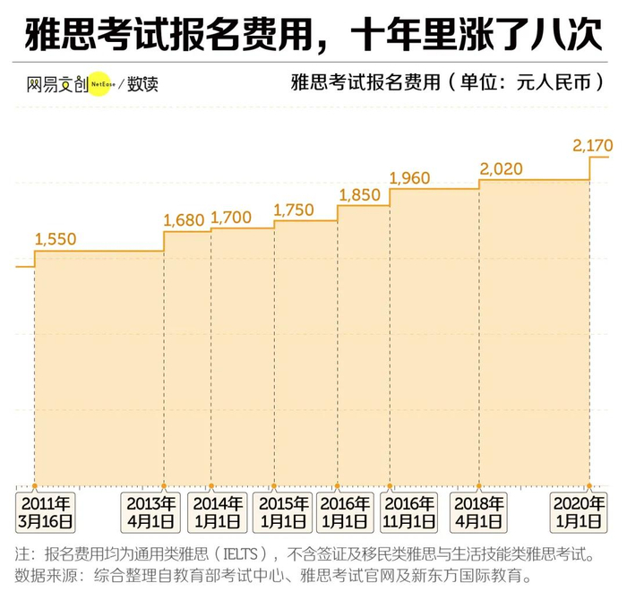 与此同时,雅思考试价格也并非一成不变,而是长期稳定上涨。想必很多人第一次接触雅思时,就已经是四位数价格。而根据我们的统计,在2011年至2020年间,雅思考试报名费用一共上涨了八次。