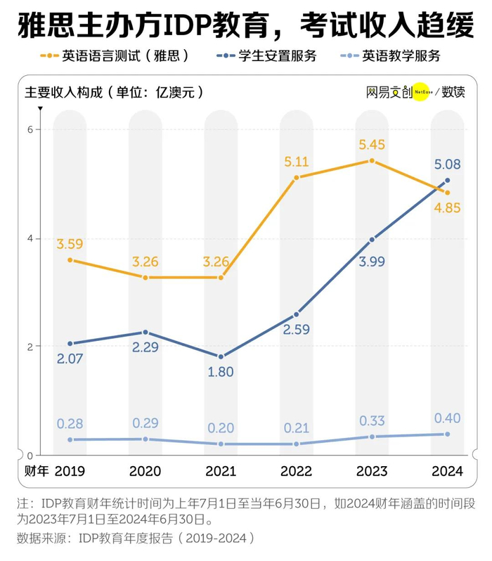 仔细看账面,2022财年,IDP教育的雅思考试业务收入从上一年3.26亿澳元跳涨至5.11亿,增长超五成。但好景不长,2024财年该项收入又回落至4.85亿澳元,不及学生安置服务的增长速度。