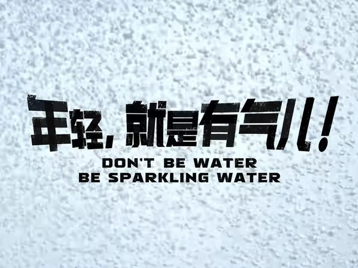 以“Don't be water”为创意核心延伸,“我们看到了,水跟气泡水在一种特性上的对比,也想用一句非常简单的中文slogan,把这种精神给点出来。”