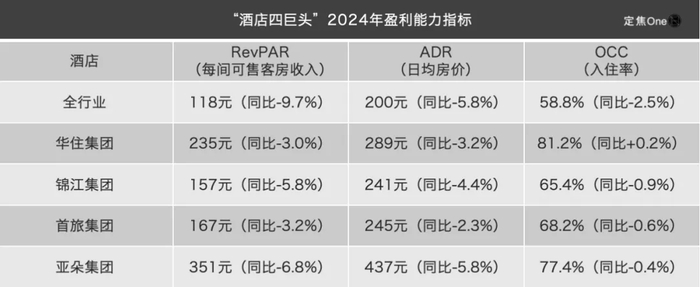 根据酒店之家数据,2024年全行业的RevPAR(每间可售客房收入)同比下降9.7%至118元;ADR(日均房价)为200元,同比减少5.8%;OCC(入住率)为58.8%,同比下降2.5%。