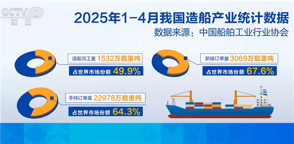 快科技5月30日消息,据央视财经报道,今年1-4月,我国造船产业新接订单量占世界市场份额继续保持全球第一。