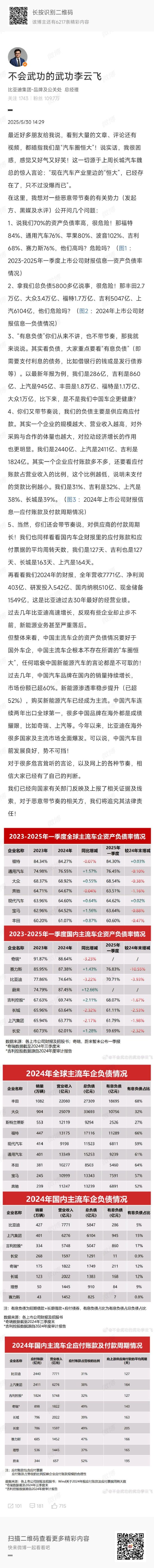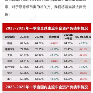 李云飞:“拿我们总负债5800多亿说事,很危险!那丰田2.7万亿、大众3.4万亿、福特1.7万亿、吉利5047亿、上汽6104亿,他们危险吗?”
