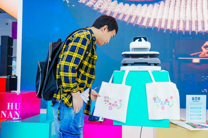在湖南馆内,乐立克打造的沉浸式互动体验空间成为展馆焦点。通过刻字机、烫画机等 DIY 智能设备,参观者可亲手制作潮流文化周边创作。从定制个性潮流服饰、文创帆布包,到设计专属帽子、杯子、拼图、贴纸等,全程体验“科技让文化变好玩”的创新魅力。