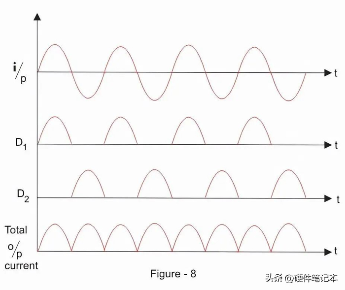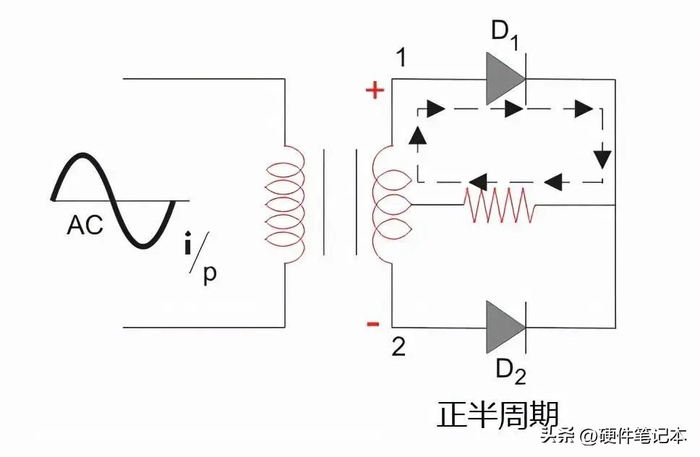 在正周期期间,二极管D 1导通,在负周期期间,二极管D 2在正周期期间导通。
