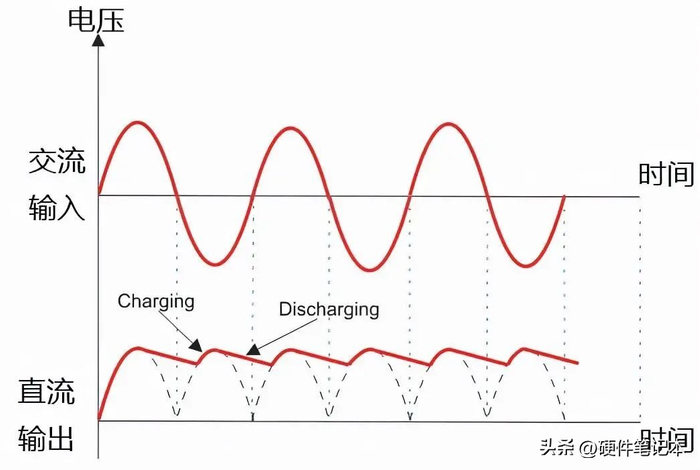 因此,为了将脉动直流电压转换为纯直流电压,使用如上所示的滤波电路。在这里,在负载上放置一个电容。