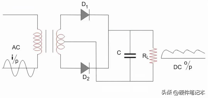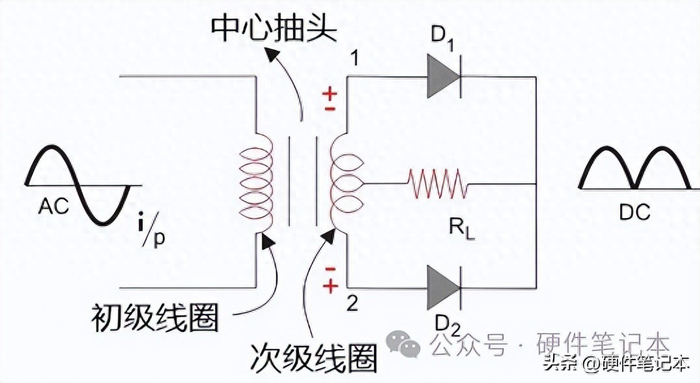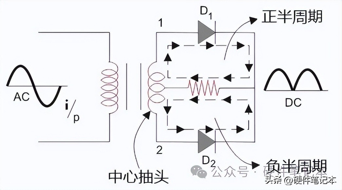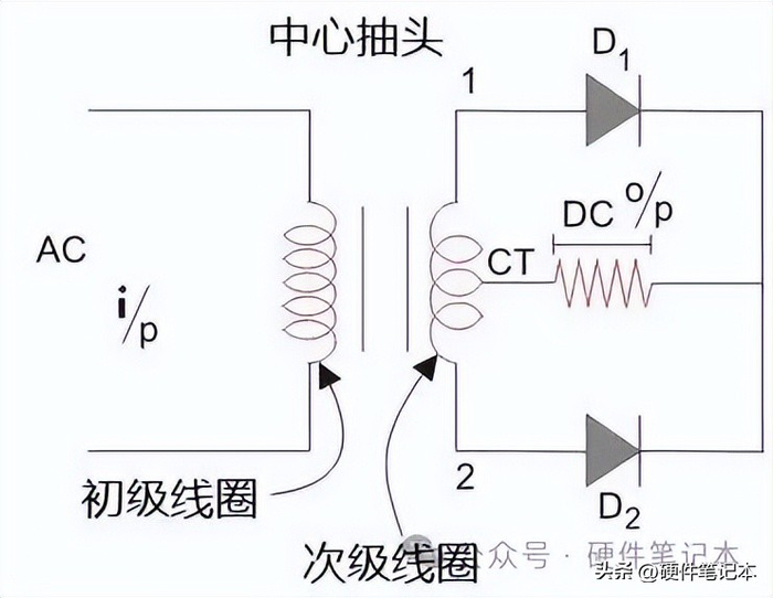 1、使用一个中心抽头变压器和两个二极管,这被称为中心抽头全波整流电路。