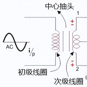 向输入变压器施加交流电压,在交流电压的正半周期内,端子1为正,中心抽头为0电位,端子2为负电位。