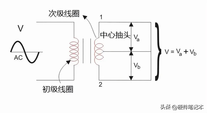 中心抽头变压器:就是一个稍稍修改了普通的变压器,它有一根额外的导线连接到次级绕组的确切中心。这种结构将交流电压分成两个相等且相反的电压,即+Ve电压(Va)和-Ve电压(Vb)。总输出电压为: