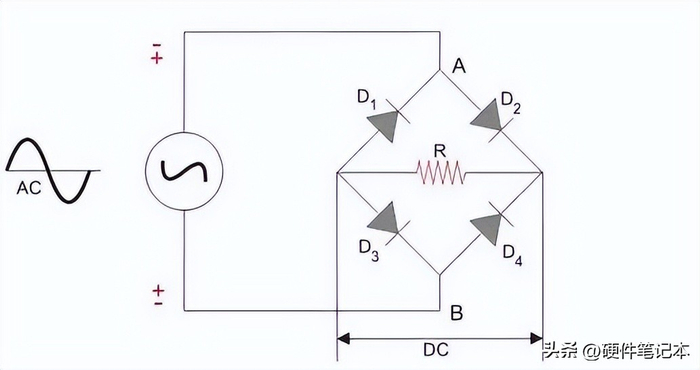 2、使用一个标准变压器,四个二极管排列成一个电桥,这个叫做桥式整流电路。