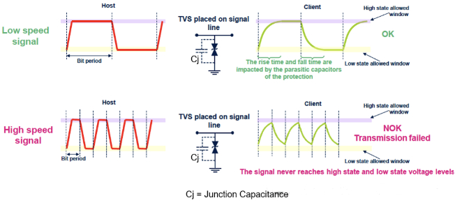 TVS的结电容(Cj)对CAN总线数据传输速率的影响至关重要,如下图所示: