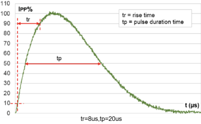 ESD所产生的能量是比较小的,所以浪涌能力一般都会采用8/20us的Surge波形来评估。