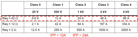 CAN总线比较常用的测试标准是Class1=500V,Class2=1000V,测试内阻为42Ω,所以针对Class1我们需要选择IPP>12A的TVS;Class2我们需要选择IPP>24A的TVS。
