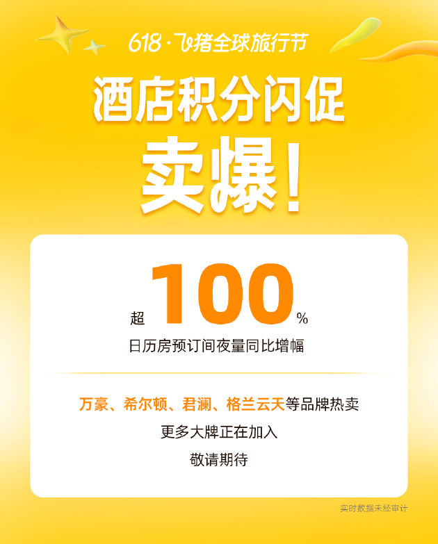 5月30日,据飞猪消息,618期间服务于酒店日历房销售的积分闪促活动,累计预订间夜量同比去年已增长超100%。