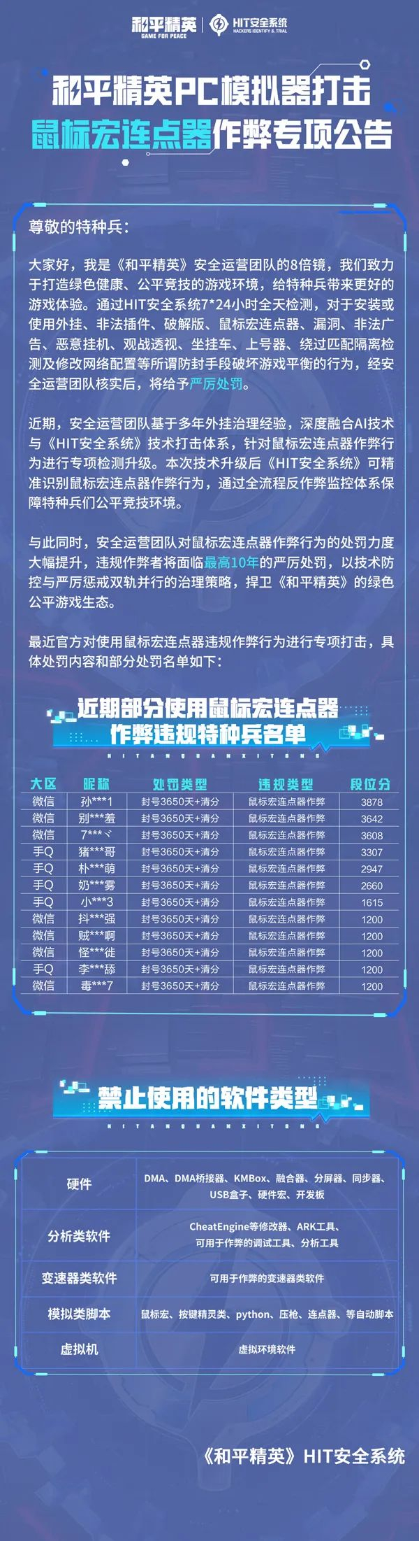 公告称,通过 HIT 安全系统 7*24 小时全天检测,对于安装或使用外挂、非法插件、破解版、鼠标宏连点器、漏洞、非法广告、恶意挂机、观战透视、坐挂车、上号器、绕过匹配隔离检测及修改网络配置等所谓防封手段破坏游戏平衡的行为,经安全运营团队核实后,将给予严厉处罚。