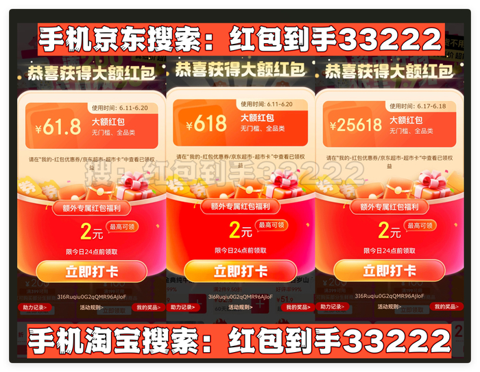 首先,划重点!今年天猫/淘宝和京东的618红包口令都是「红包到手33222」要记住!领的红包大小和你搜索的什么口令有关的!这个双平台通用口令包领到大的!记得每天去领!