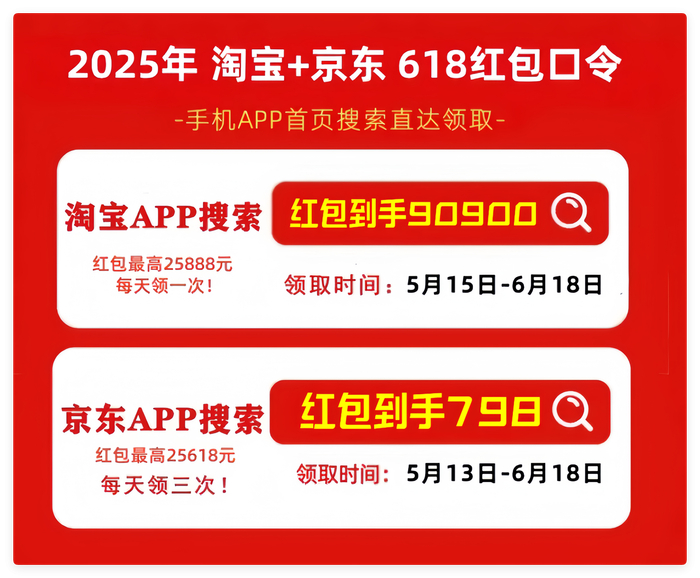 首先,划重点!2025年最新的京东618红包口令是「红包到手798」,天猫/淘宝618红包口令是「红包到手90900」记得每天去领,领的红包大小和你搜索的什么口令有关的!