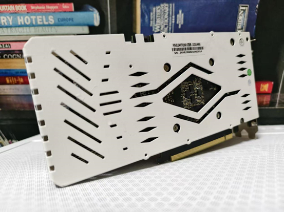 在显卡背面的地方,艾尔莎RTX3060幻雷者12G配备了一块白色的金属背板,背板设计又多处的镂空,在长时间的使用之下,PCB也可以保持平直,不会受重力影响而弯曲。