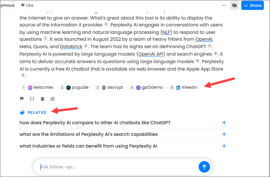 Perplexity还有另一个显著特点,它支持连续追问,有点像“AI问答社区”。Perplexity 创始团队有来自美版知乎Quora的成员,使用Perplexity时你可以一问再问,它会“记住你前一个问题”,在上下文里逐步深入。不像传统搜索,每次都是“一问一搜”,用户得自己整合答案。